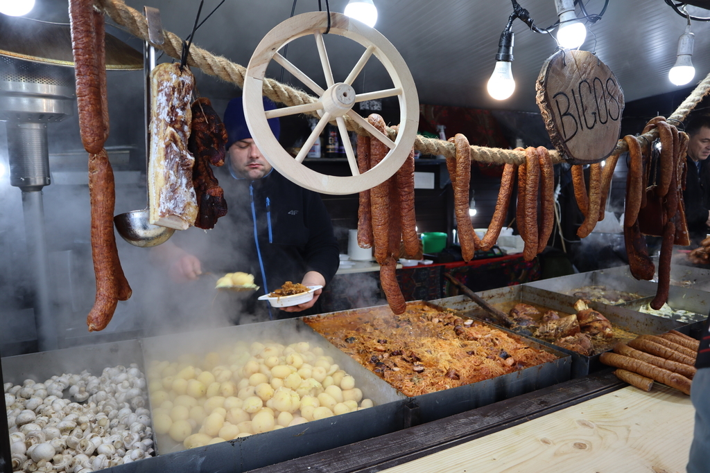 駅に到着後、クラクフで有名というベーグルのようなパン(オブヴァジャーネックというらしい)を売る屋台を早速見つけたので購入。1.8ズウォチだったので日本円で50円ぐらい。ベーグルのよりも噛みごたえがあって、もっちりさはベーグルより無い感じ。美味しかった!!そして宿泊先に向かうまでに、食べてみたかったビゴスの屋台があったので購入。ソーセージ、ザワークラウトの相性抜群。特にザワークラウトがめちゃくちゃ美味しかった。ドイツで食べるものよりも酸味が控えめでザワークラウトだけでパクパク食べれちゃう。